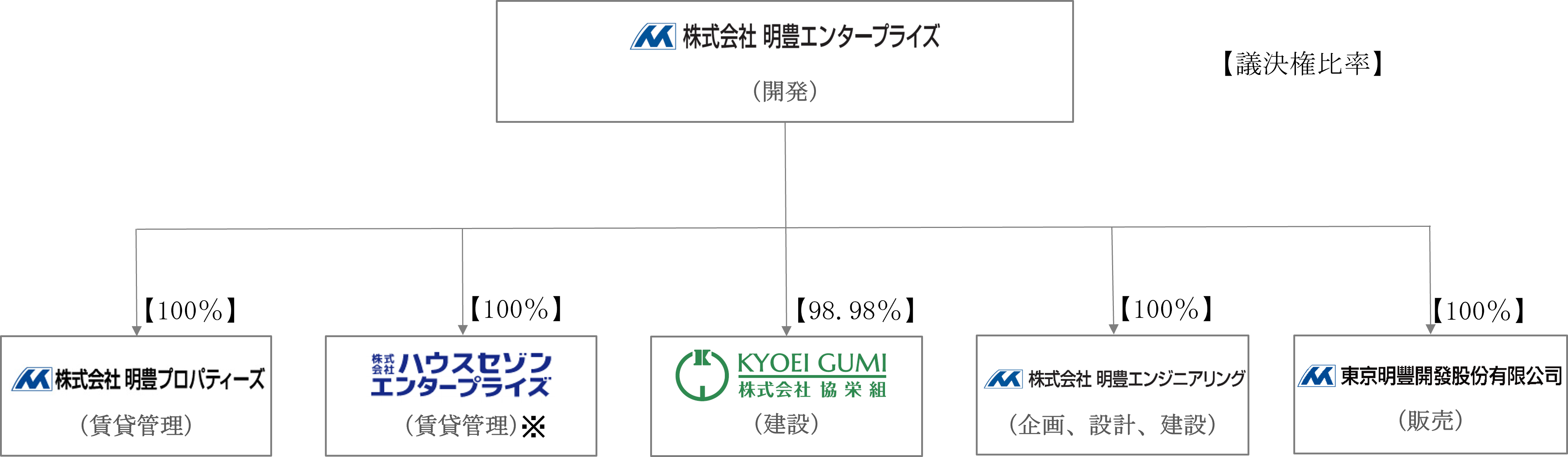 創業56年、物造りにこだわった信頼と実績の東証上場デベロッパーとして、東京23区を中心に200棟を超える“新築1棟投資用賃貸住宅”を供給している株式会社明豊エンタープライズ(東京都目黒区:代表取締役 矢吹 満)を親会社とし、賃貸管理会社の株式会社明豊プロパティーズ(東京都目黒区:代表取締役 竹内 智大)、株式会社ハウスセゾンエンタープライズ(京都府京都市:代表取締役 奥山 秀昭)、建設会社の株式会社明豊エンジニアリング(東京都目黒区:代表取締役 阪本 伸司)、株式会社協栄組(東京都世田谷区:取締役 徳満 亮輔)、海外現地法人の東京明豐開發股份有限公司(本社 台北市中山区:代表取締役 内田千博)で構成されております。