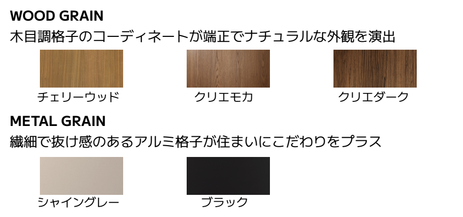 単色のアルミに立基調の格子をあしらったモダンなデザイン。人気の定番カラーの設定により、エクステリア商材とのトータルコーディネートが可能に