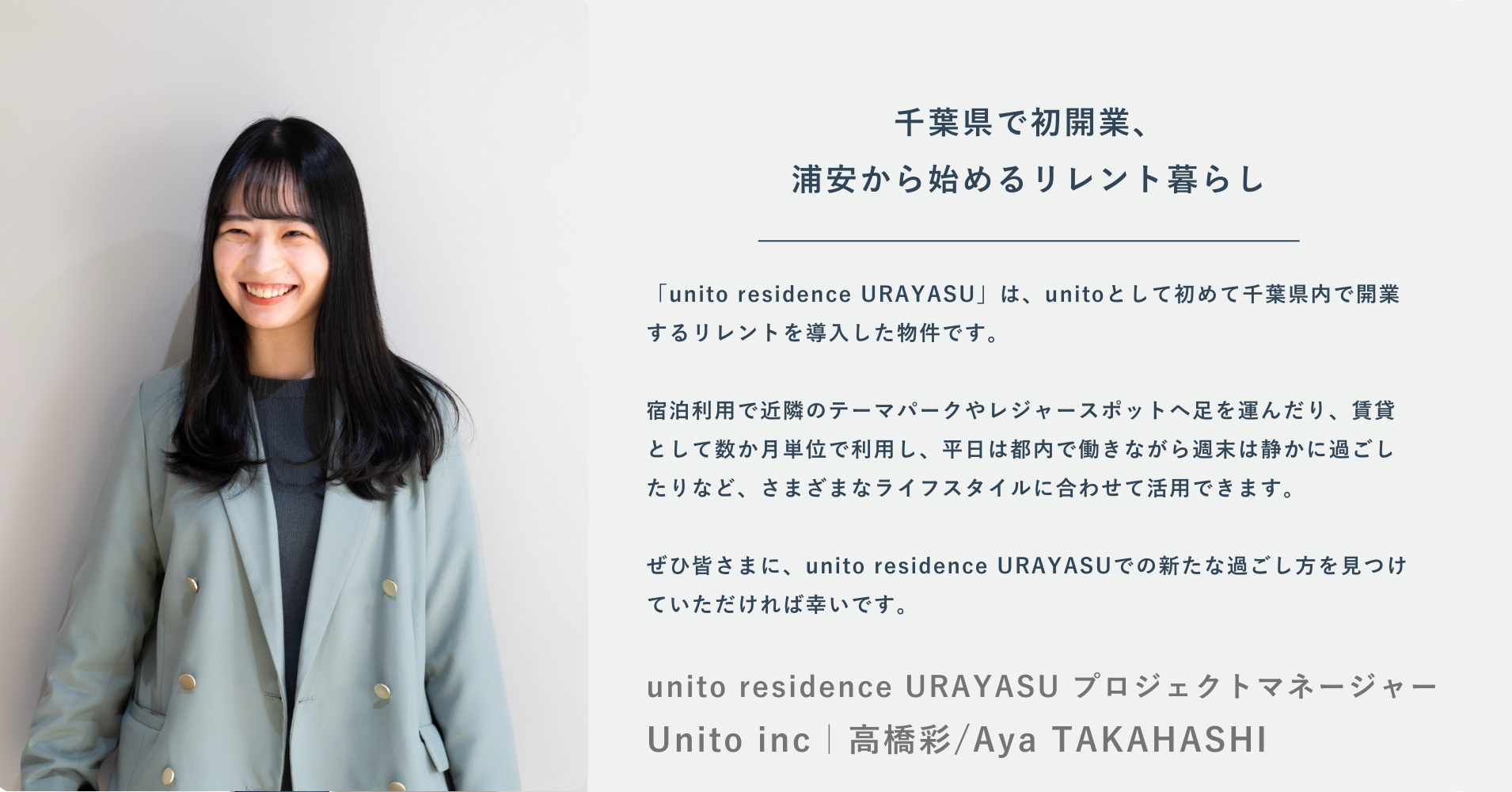 株式会社Unito(本社:東京都目黒区、代表取締役:近藤佑太朗、読み:ユニット、以下Unito)は、Unitoが独自*展開する日数単位の家賃システム「リレント」の仕組みを導入した物件「unito residence 浦安(正式名称:unito residence URAYASU、所在地:千葉県浦安市)を開業します。