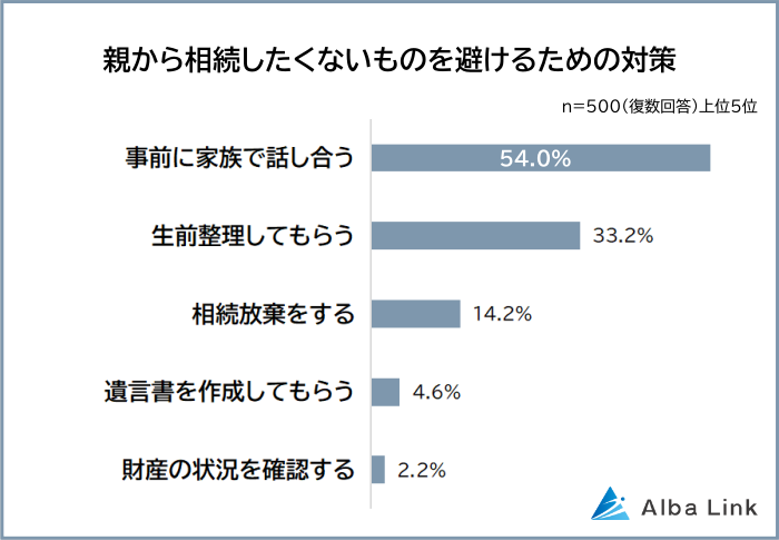 500人に「相続したくないものを避けるための対策」を聞いたところ、もっとも多かった回答は「事前に家族で話し合う(54.0%)」で、半数以上から回答を集めました。2位「生前整理してもらう(33.2%)」、3位「相続放棄をする(14.2%)」が続きます。