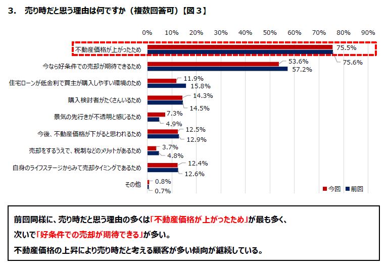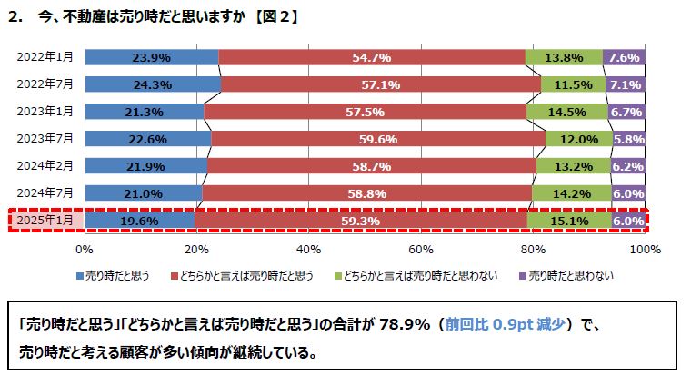 2.不動産の売り時感は、78.9%が「売り時」「どちらかと言えば売り時」と回答し、前回
