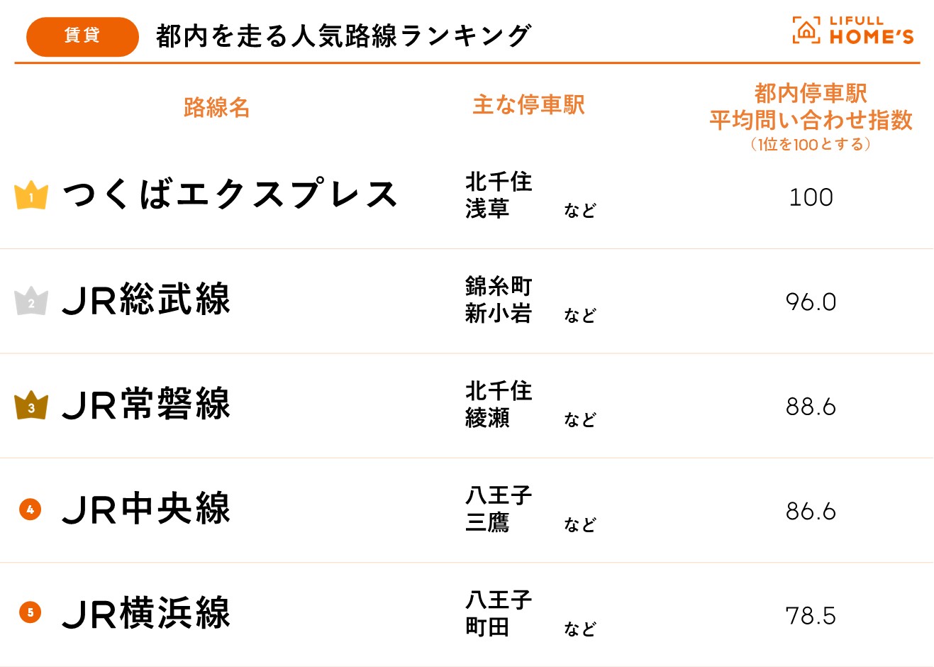 まず、都内停車駅の賃貸物件平均問い合わせ数を路線別に算出し、多い順にランキング化したところ、1位が「つくばエクスプレス」、2位以降は「JR総武線」「JR常磐線」「JR中央線」「JR横浜線」とJRの路線が続きました。
