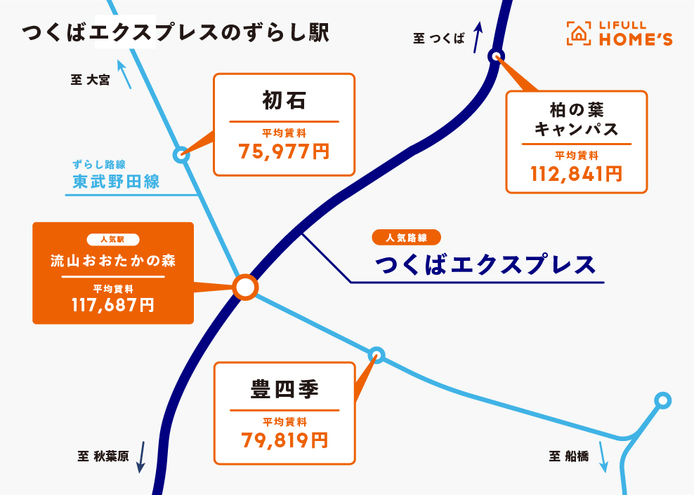 人気路線の「つくばエクスプレス」の1駅隣、『柏の葉キャンパス』は平均賃料112,841円の一方で、流山おおたかの森駅で交わる東武野田線で1駅の『初石』は75,977円、『豊四季』は79,819円と、それぞれ3万円以上安価になっています。