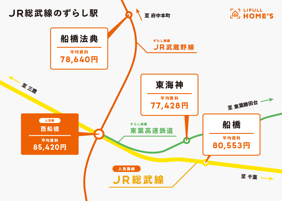 人気路線である「JR総武線」の1駅隣、『船橋』は平均賃料80,553円の一方で、西船橋駅で交わるJR武蔵野線で1駅の『船橋法典』は78,640円、東葉高速鉄道で1駅の『東海神』は77,428円といずれもJR総武線より相場が低くなっています。