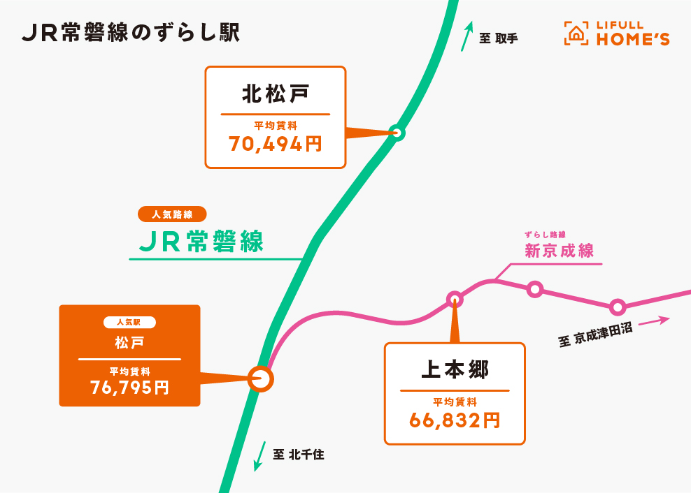 人気路線である「JR常磐線」の1駅隣、『北松戸』の平均賃料は70,494円ですが、松戸が起点の新京成線で1駅隣の『上本郷』は平均賃料66,832円と、お得な相場感となっています。