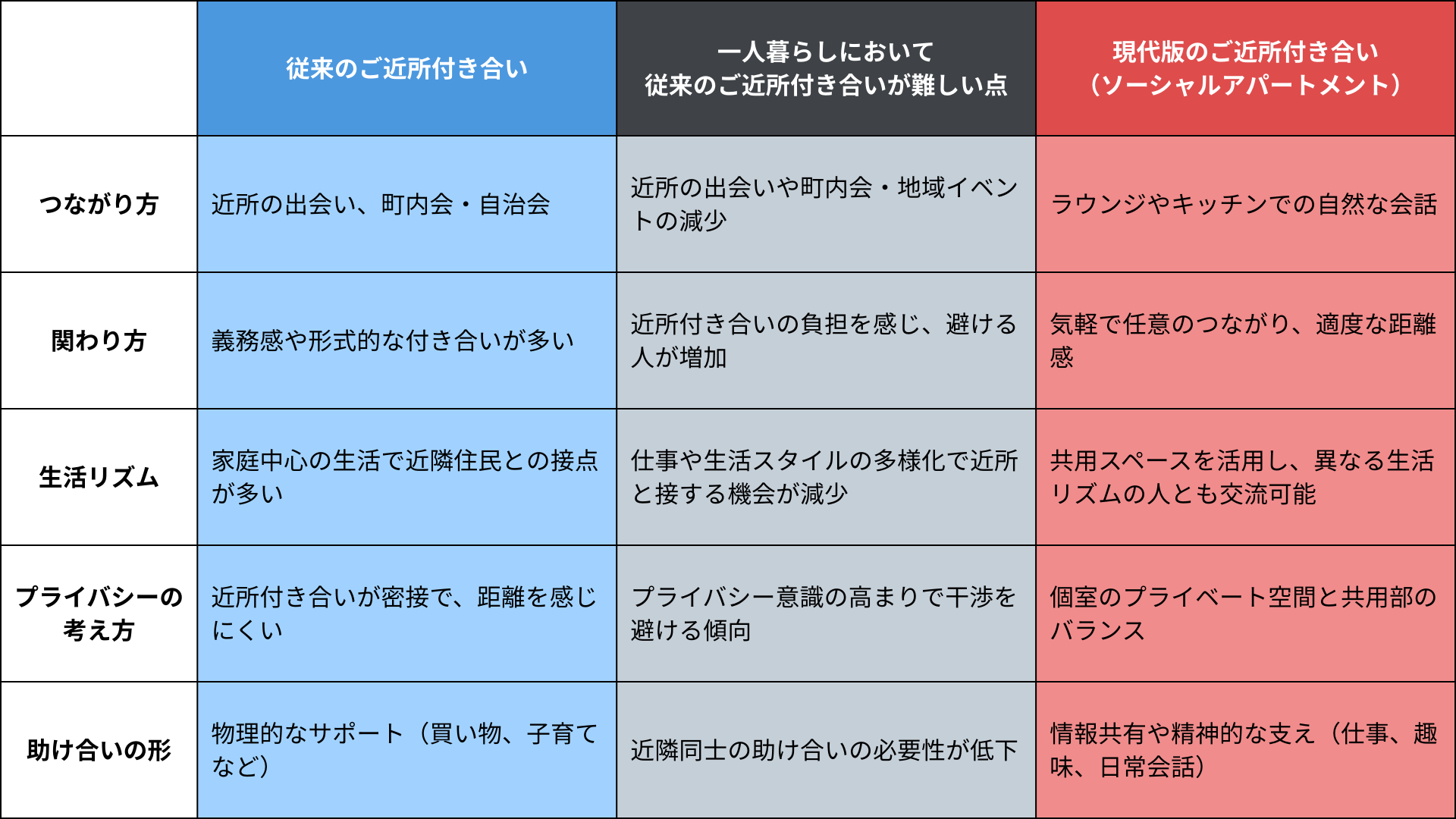 こうした状況の中で、ソーシャルアパートメントはプライバシーを守りながらも自然に人とつながれる仕組みを提供し、自宅を中心とした気軽な交流を促進します。これにより、現代のライフスタイルに合った新しい形のご近所付き合いが生まれています。