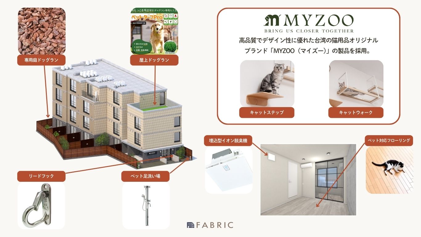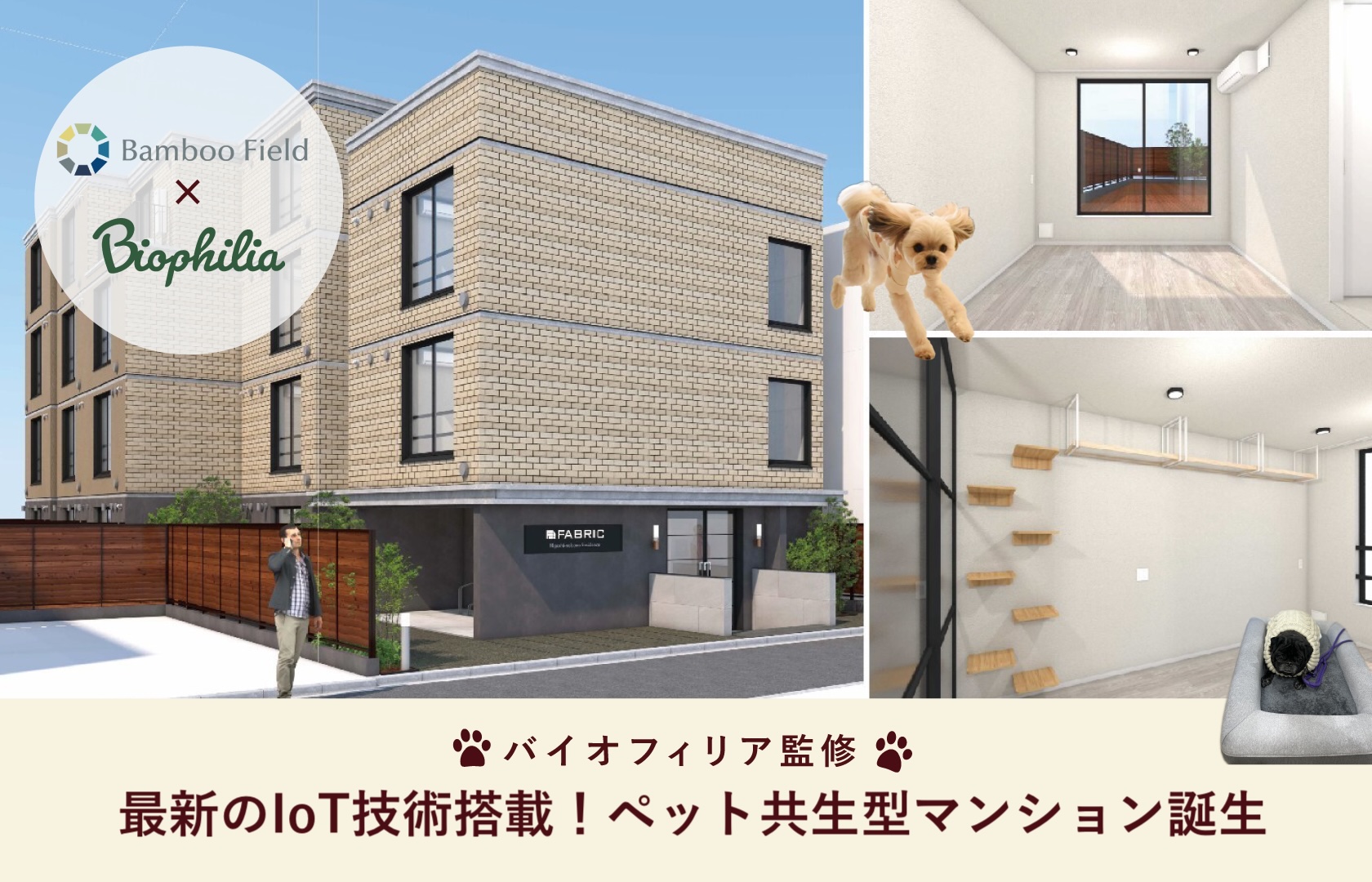 フレッシュドッグフード(※1)2年連続売上No.1(※2)、会員愛犬数30万頭(※3)を突破した愛犬用手作りごはん「CoCo Gourmet(以下:ココグルメ)」、愛猫用手作りごはん「Miao Gourmet(以下:ミャオグルメ)」、愛猫用おやつ「にゃっち」を開発・販売する株式会社バイオフィリア(本社:東京都新宿区、代表:岩橋洸太、以下:当社)は、ペットライフの専門知識を活かし、株式会社バンブーフィールド(本社:東京都港区、代表取締役:佐々野泰将)のペット共生型×IoTコンセプトマンション「FABRIC 東中野 Residence」(2025年3月竣工予定)を監修しました。本物件は、ペットの健康と快適性を第一に考えた設計により、「住める」だけでなく「住みやすい」環境を実現しています。
