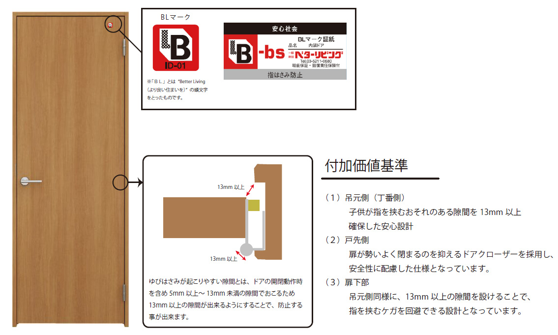これは、2023年6月にBL(優良住宅部品)認定を取得した「内装ドア」に、指はさみ防止機能を追加した型式として認定されたものです。