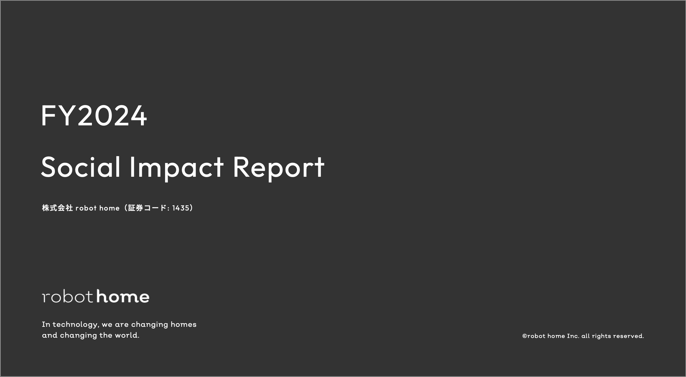 株式会社 robot home(本社:東京都中央区/代表取締役 CEO:古木 大咲/証券コード:1435、以下当社)は、当社と社会との関係性やその責任、ステークホルダーとのつながりについて分析し、持続可能性の観点からレポートにまとめ、この度初めてソーシャルインパクトレポートを公開いたしました。「世界を代表するテクノロジー企業となり、不動産投資を通じて持続可能な社会を実現する」というビジョンのもと、不動産を通じた社会課題の解決を目指す当社の取り組みをご紹介しております。