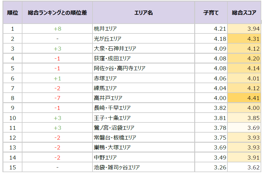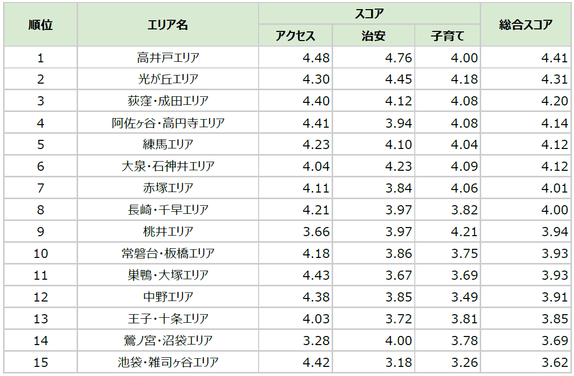 大泉・石神井エリアは総合ランキングでは練馬エリアと並列、阿佐ヶ谷・高円寺エリアには0.02ポイントという僅差でランキング外になってしまっていました。子育てスコアのみを集計したランキングでは3位にランクインしています。ここもおそらく交通の利便性でスコアに差が生じたものと思われます。西武池袋線を利用することができるのですが、大泉学園駅など、駅によっては急行電車が停車しない場合があるため、不便さを感じる時が多々あるとユーザー様からコメントをいただいております。