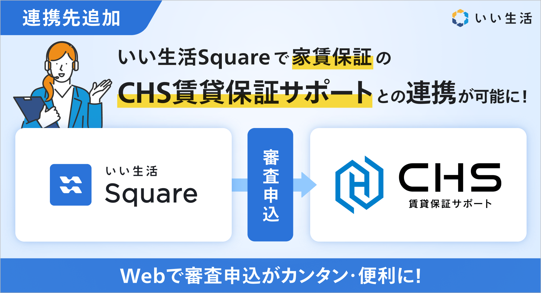 不動産業務を網羅するバーティカルSaaSと業務効率を推進するBPaaS(※1)で不動産市場のDXを推進する株式会社いい生活(東京都港区、代表取締役社長 CEO:前野 善一、東証スタンダード:3796、以下:いい生活)は、株式会社賃貸保証サポート(本社:東京都新宿区、代表取締役:松田 佑嗣、以下:賃貸保証サポート)と提携し、いい生活が提供するWeb入居申込システム「いい生活Square」において、保証申込について連携を開始したことをお知らせいたします。今回の連携により、賃貸に入居したい消費者の情報を不動産管理会社から家賃保証会社に効率よく連携し、入居申込から審査開始に至る手続きの迅速化に貢献します。