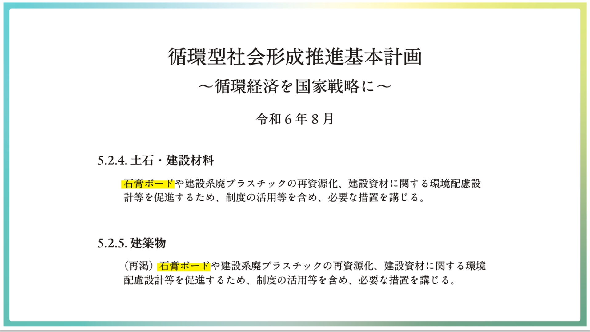 2024年8月に発表された第五次循環型社会形成推進基本計画~資源循環を国家戦略に~において、土石・建設材料と建築物のカテゴリーではプラスチックより前に石膏ボードの記載があります。