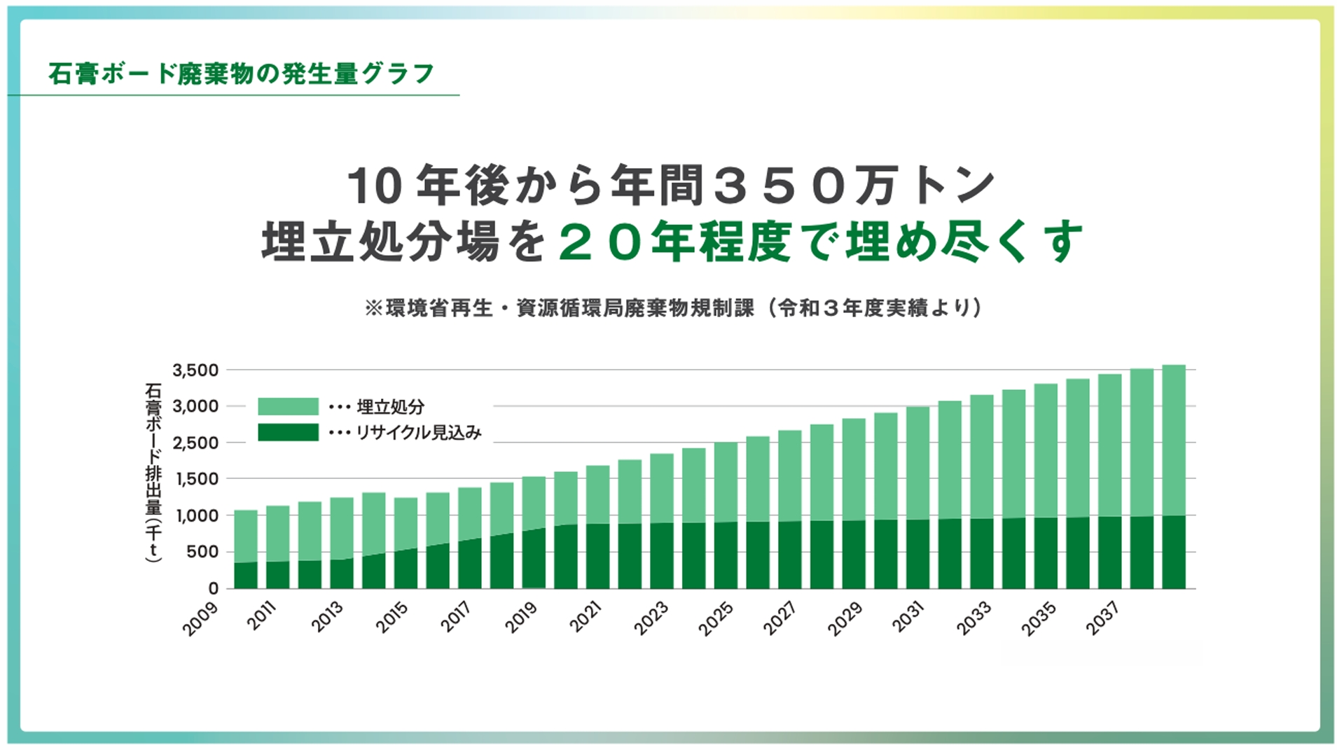 2037年から毎年350万トンの石膏ボード廃棄物が発生すると言われています。石膏ボード廃棄物は非常にかさばるため、石膏ボードだけで現在の管理型埋立処分場を約30年で埋め尽くしてしまうインパクトがあります。