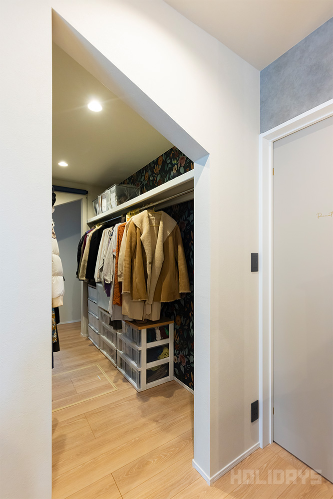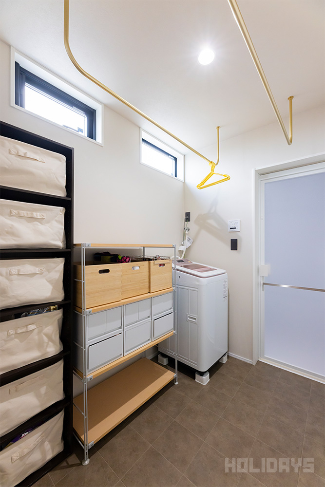 玄関ホールとLDKを繋ぐファミリークローゼットはランドリールームへの行き来もしやすく、洗濯物をハンガーにかけたまま収納できる家事楽な間取りになっています。また玄関ホールに洗面を設けているため、帰宅時には手を洗い、上着をかけてLDKに入るという帰宅動線も完璧。