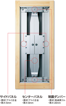 木造軸組住宅用の制震装置「MGEO-N」およびMGEOシリーズの木質系工業化住宅用制震装置「MGEO」は、1階内壁に2か所配置※4することで高い制震性を発揮する制震パネルです。地震などの建物を変形させる力をテコの原理で増幅させ、センターパネルが地震エネルギーを内部の制震ダンパーに伝えて、制震ダンパー部の高減衰ゴムが地震エネルギーを熱エネルギーに変換・吸収し、揺れを抑えます。高減衰ゴムは住友ゴム工業株式会社が培ってきたレーシングタイヤの開発技術を応用して開発されており、促進劣化試験※5では、約100年相当の高い耐久性を確認しています。