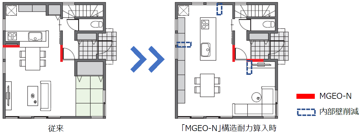 「MGEO-N」を構造耐力に見込むことで、内部壁量を削減することができ、プランニングの自由度が向上します。家族のコミュニケーションを育む開放的なリビングや、家事をより効率的にして食事を楽しめる連続するダイニングキッチンなど、開放的な空間から豊かな暮らしを実現します。