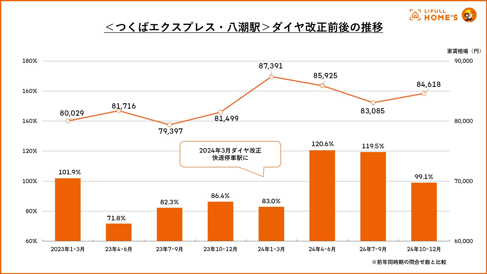 埼玉県八潮市にある「八潮」は、つくばエクスプレスで「秋葉原」から8駅目の駅です。2024年3月のダイヤ改正で新たに快速列車の停車駅となり、運行する全ての列車を利用できるようになりました。「八潮」周辺の賃貸物件への問合せ数を前年と比較すると、2024年4-6月は前年同期比120.6%、7-9月は同119.5%と、ダイヤ改正後に問合せが増加しています。なお、「八潮」で快速列車と普通列車が接続することにより周辺駅の利便性も向上しました。