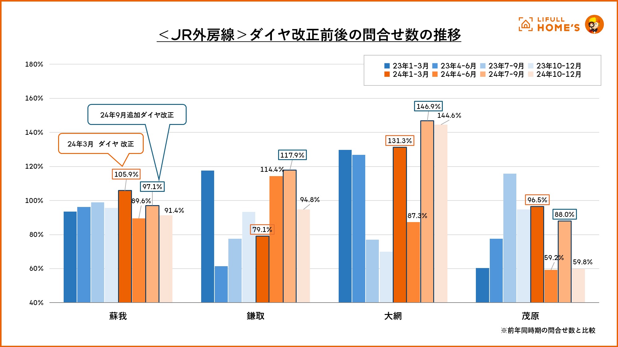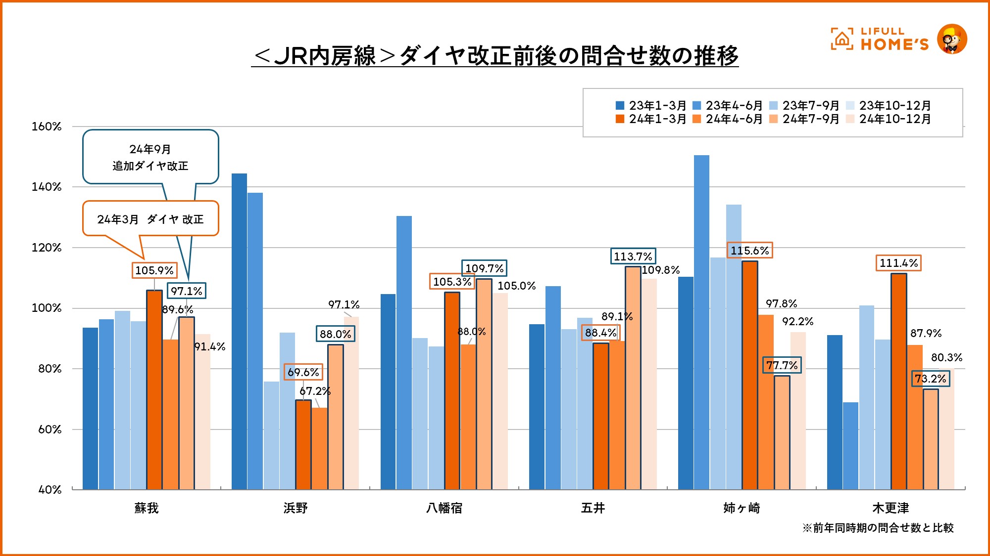 なお、その後追加のダイヤ変更(2024年9月)が行われた同年7-9月には、「八幡宿」(前年同期比109.7%)と「五井」(同113.7%)で問合せが回復。一方で「蘇我」「浜野」「姉ヶ崎」「木更津」の4駅は前年水準を下回ったままとなっています。