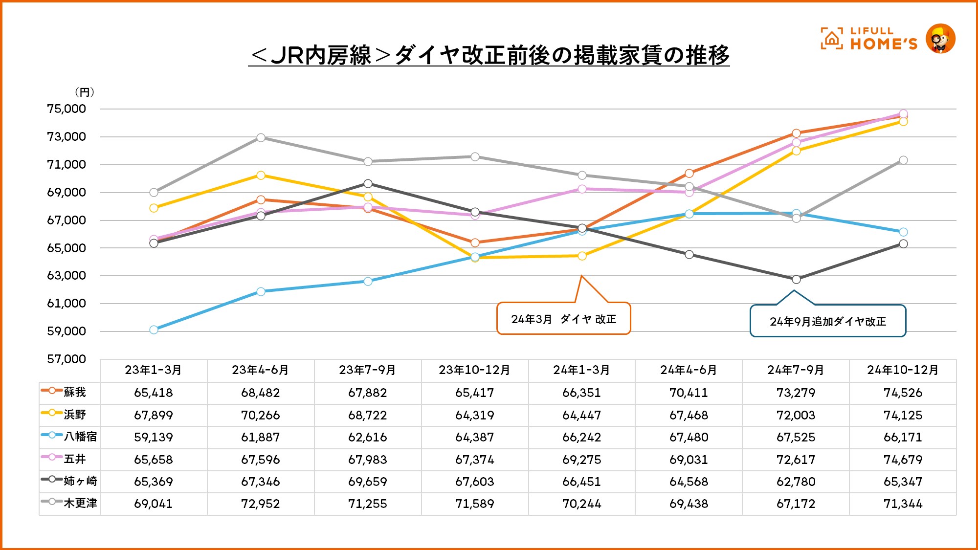 JR内房線の各駅のうち、一定以上の問合せがあった「蘇我」「浜野」「八幡宿」「五井」「姉ヶ崎」「木更津」周辺の賃貸物件への問合せ数は、ダイヤ改正直後の2024年4-6月に「蘇我」で前年同期比89.6%、「浜野」で同67.2%、「八幡宿」で同88.0%、「五井」で同89.1%、「姉ヶ崎」で同97.8%、「木更津」で同87.9%と、全6駅で前年より減少しました。