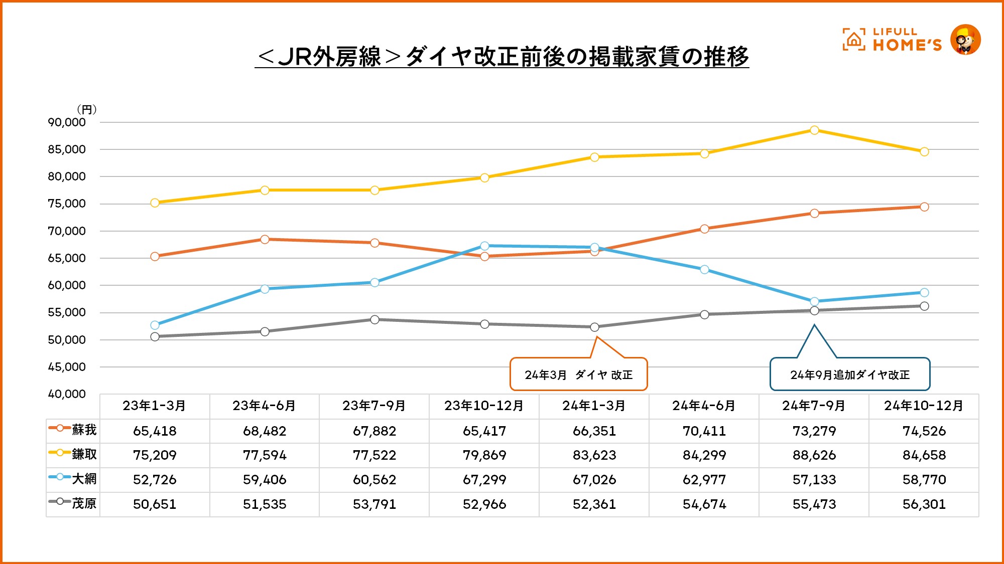 JR外房線の各駅のうち、一定以上の問合せがあった「蘇我」「鎌取」「大網」「茂原」周辺の賃貸物件への問合せ数は、ダイヤ改正直後の2024年4-6月に「蘇我」で前年同期比89.6%、「鎌取」で同114.4%、「大網」で同87.3%、「茂原」で同69.2%と、全4駅中3駅で前年より減少しました。追加のダイヤ変更(2024年9月)が実施された2024年7-9月には「鎌取」「大網」の2駅で前年よりも問合せが増加しましたが、「茂原」では前年同期比88.0%となるなど、問合せ数の減少が継続しています。