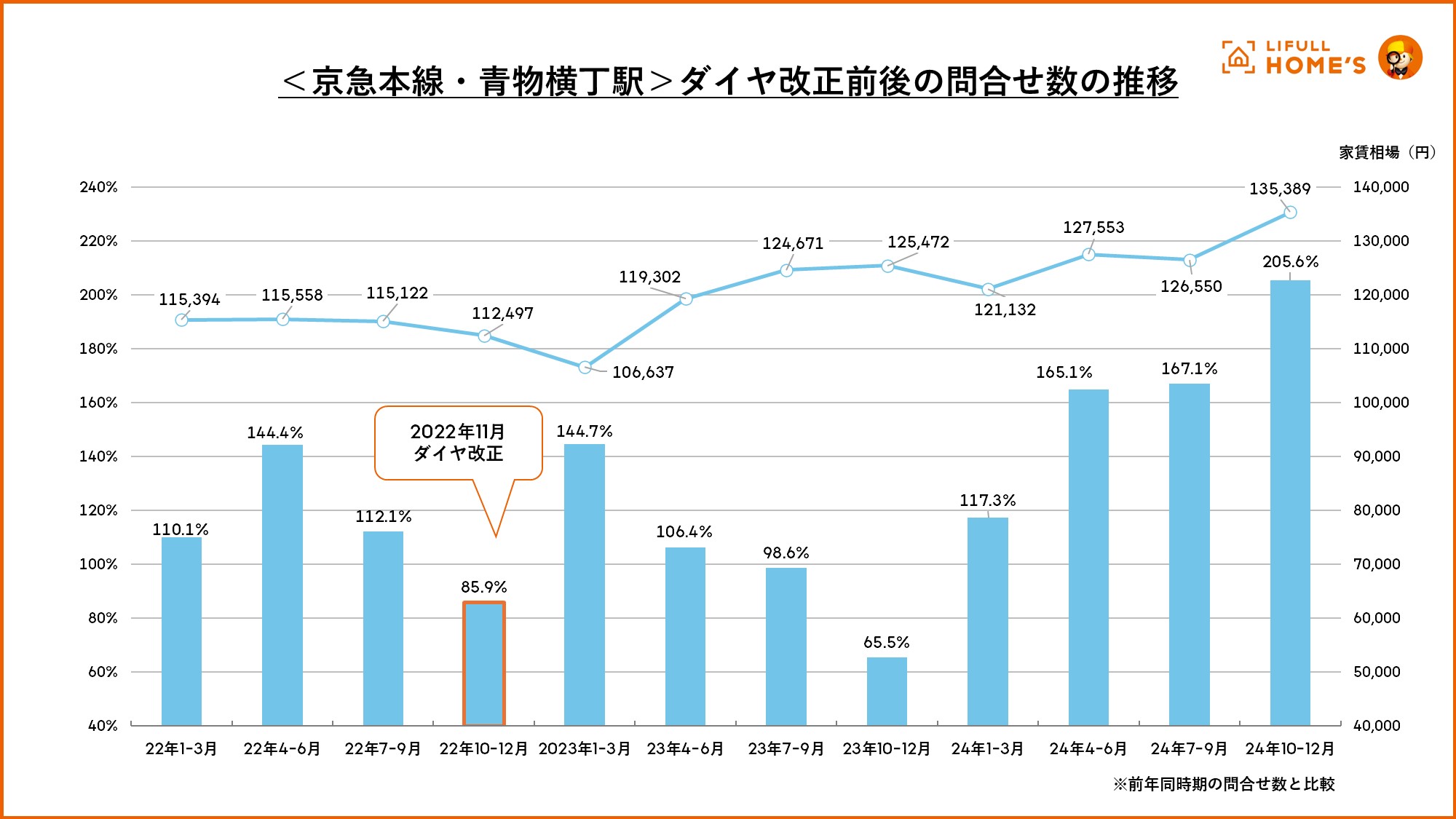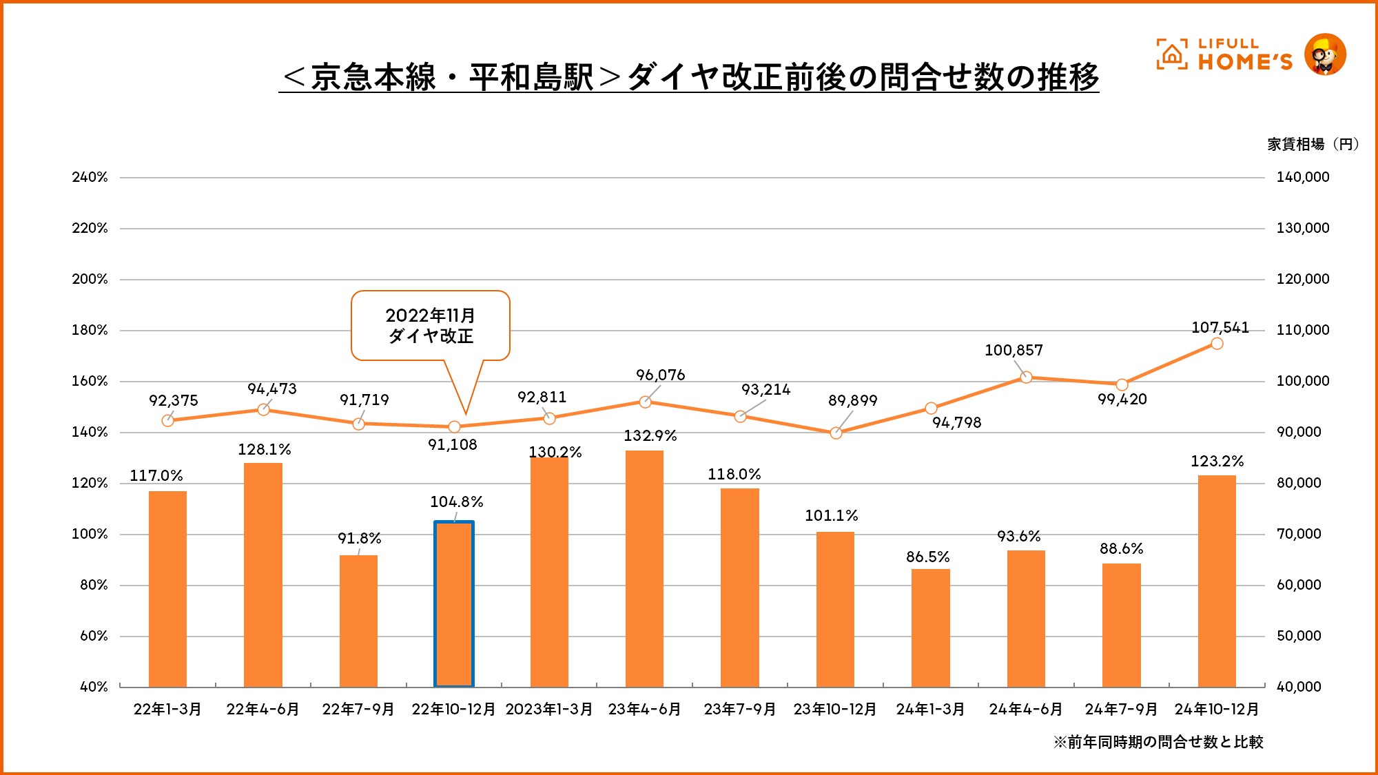 両駅周辺の賃貸物件への問合せ数は、「青物横丁」ではダイヤ改正時の2022年10-12月は前年同月比85.9%でしたが、改正後の2023年1-3月には同144.7%に、「平和島」では改正時が同104.8%でしたが、改正後は同130.2%に、それぞれダイヤ改正を境に問合せ数が前年から大きく伸長しています。