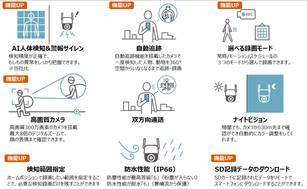 300万画素の高画質に加え、AI人体検知、警報サイレン、自動追尾機能などを新搭載