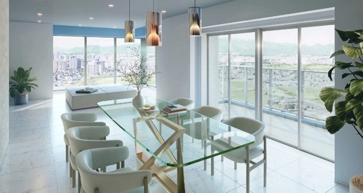 居住棟は31階建とし、住戸は眺望を重視し南・西・北側にリビングバルコニーを配したプランとしました。三井住友建設(株)独自開発のマンション工法システム「Sulatto Rotary Tower」を採用することで居室内の大梁を大幅に削減し、居住空間の広がりや開放感を最大限享受できる構造とすることで、タワーマンションだからこそのダイナミックな眺望を愉しめる住まいを実現しています。