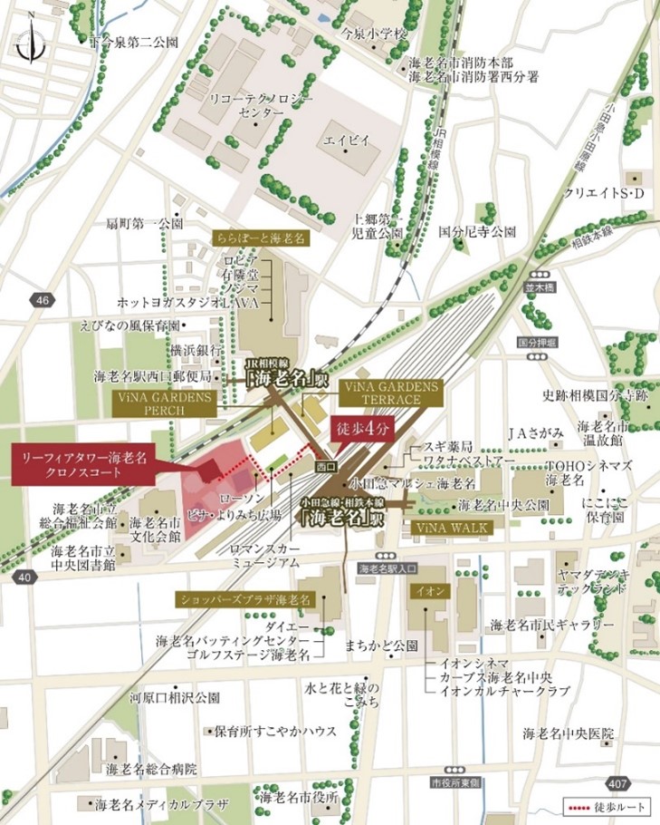 小田急線・相鉄線海老名駅とJR相模線海老名駅の間に広がる3.5ha超の開発エリア「ViNA GARDENS」は、「憩う」「くらす」「育む」をコンセプトに、海老名駅を中心とした新たな街づくりを進めています。東側の「賑わい創出エリア」には、駅直結のオフィス棟「ViNA GARDENS OFFICE」や商業施設「ViNA GARDENS TERRACE」のほか、フィットネスクラブ、クリニックモール、複合医療施設などが入る「ViNA GARDENS PERCH」があり、多くの人々で賑わいます。西側の「くらしエリア」には、本物件を含む3棟のタワーマンションを中心に、安心、安全、快適に暮らすことのできる環境を整えており、郊外における「ゆたかなくらし」の実現に貢献しています。