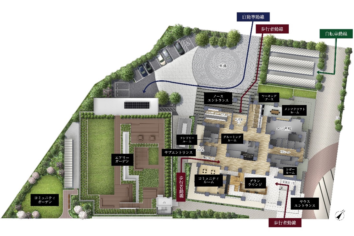 そのほか、駐輪場や駐車場棟を独立させることにより、車・自転車・歩行者のアプローチ動線を分離させ、居住者がより安全・安心に暮らせるように配慮しています。