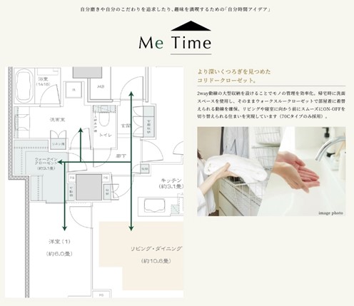 住戸計画では、2~16階の低層階(約46~92㎡)、17~30階の高層階(約62~100㎡)、31階のプレミアム階(約100~121㎡)の3層構成とし、1LDK~4LDK全33タイプの多彩なバリエーションを用意しているほか、フラットスラブを取り入れることで、従来水回り計画の制約の多かった将来のリフォーム・リノベーション工事で柔軟な間取り変更が可能となるなど、自由度の高い計画としています。各住戸に幅広い間口を確保しワイドリビング※を実現するほか、角住戸率は38%以上を確保しています。また、本物件では、住まう方の「こうだったらいいのにな…」という想いから着想を得た空間アイデア「想いカタチ.ファクトリー」のうち、「MeTime」「プラグライフ」「オフチップス」等の中から複数のアイデアを採用しました。