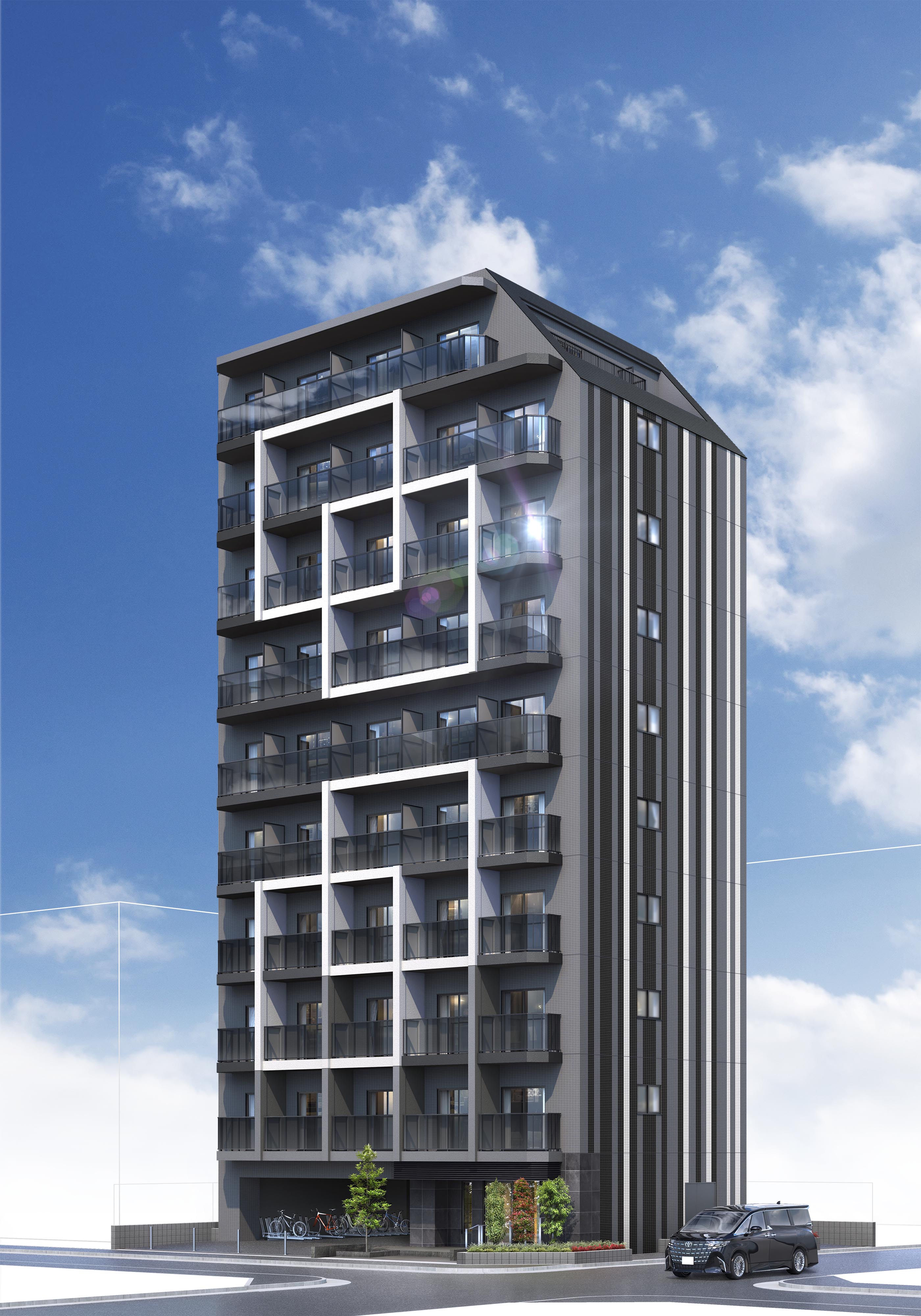 グレー系をベースに、側面には縦に伸びるストライプ パターンを、正面はバルコニースラブと袖壁に合わせ て印象的なグリッドパターンを描き、インパクトのある モダンファサードを創出します。
