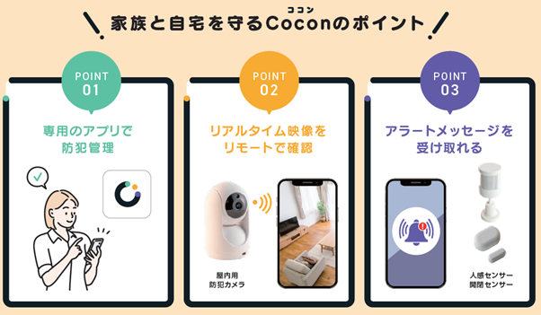UMEが提供する「Cocon」は、集合住宅や戸建て向けのホームセキュリティに特化したスマートホームサービスです。低コストで大切な家族や財産を守り、安心な暮らしを実現します。