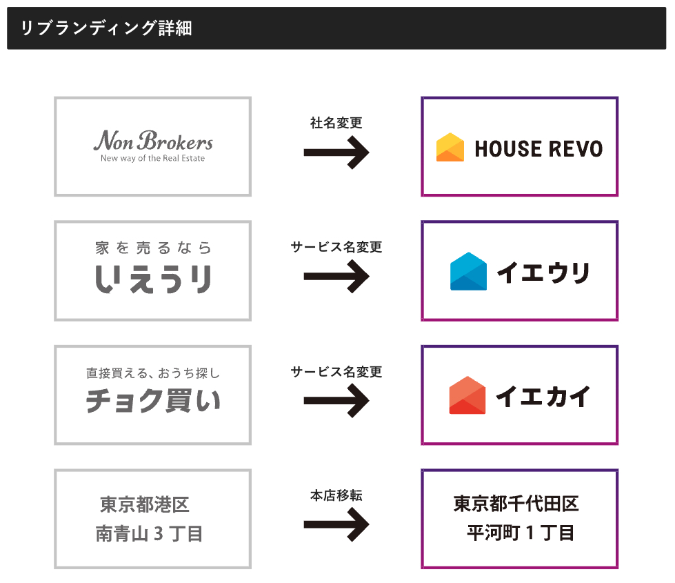 この度、「イエウリ」「イエカイ」にサービス名を変更し、新たなロゴマークで新ブランドに生まれ変わります。「HOUSE REVO」が目指すビジョン・ミッションを浸透させ、従来の不動産取引における煩雑さや不透明さ、心理的負担を根本的に解消し、これまで以上の「顧客中心主義」を体現するため、より力強い統合的なブランド・アイデンティティを確立することを目指します。