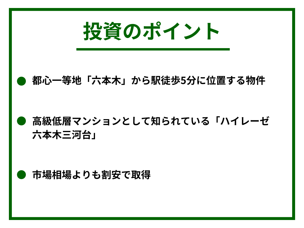 本ファンドは、東京メトロ日比谷線「六本木」駅から徒歩5分に位置する高級低層マンション「ハイレーゼ六本木三河台」の一室を投資対象としています。