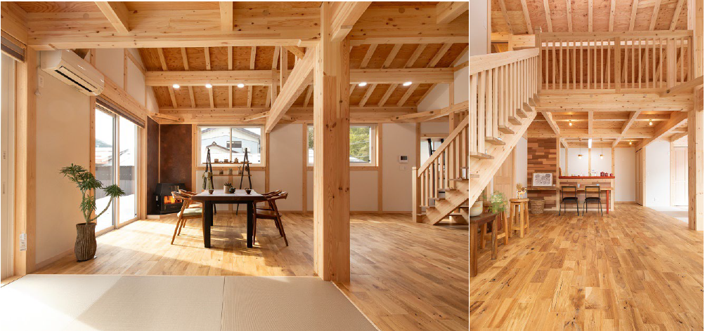 ナチュラルカラーで統一された屋内は、平屋でありながら大きな吹き抜けと大黒柱が悠々と空間を支え、木の家が好きな方からニーズが多い、畳コーナーや薪ストーブ、オリジナルのダイニングカウンターなどはもちろん、ユニークなミラー照明のサニタリー&スケルトンのバスルームなど遊び心も満載。中でも注目は14.21坪(約28帖)のロフト。使い方はお客様次第、暮らし方の夢が広がります。