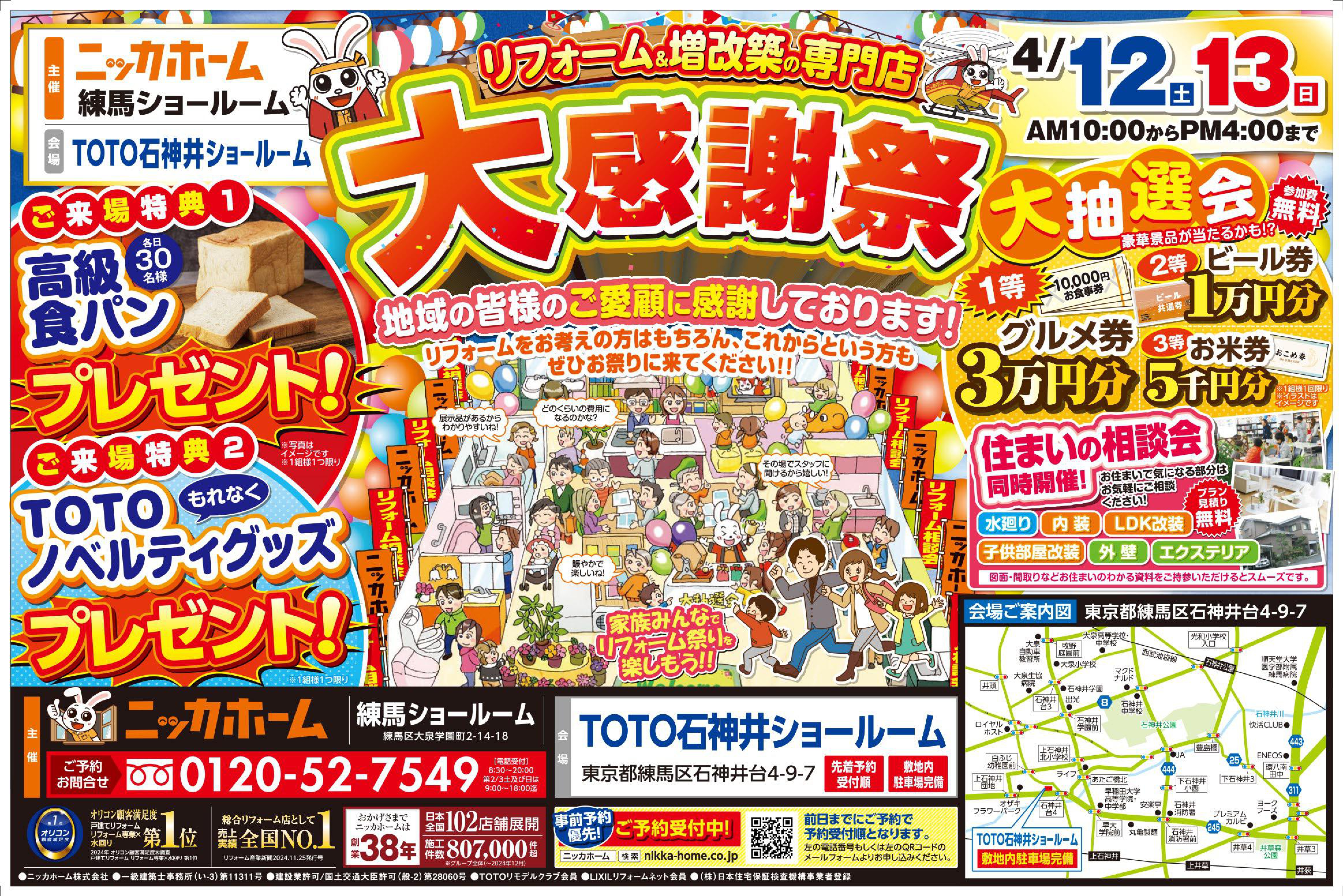 ニッカホーム株式会社(本社:愛知県名古屋市緑区篭⼭、代表取締役社長:西田裕久、以下 ニッカホーム)の関東支社・ニッカホーム練馬ショールームが「大感謝祭」と題したイベントを開催決定!