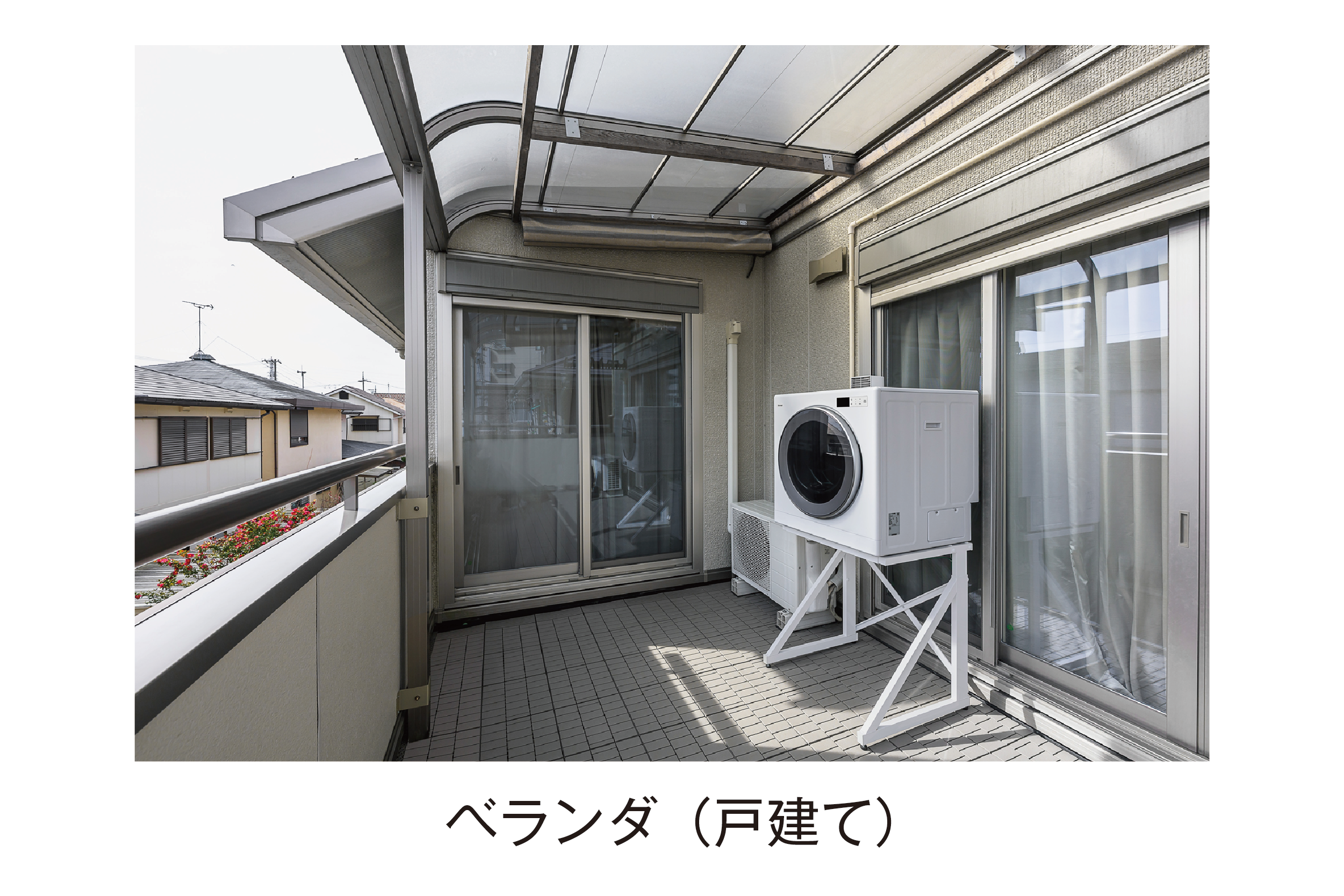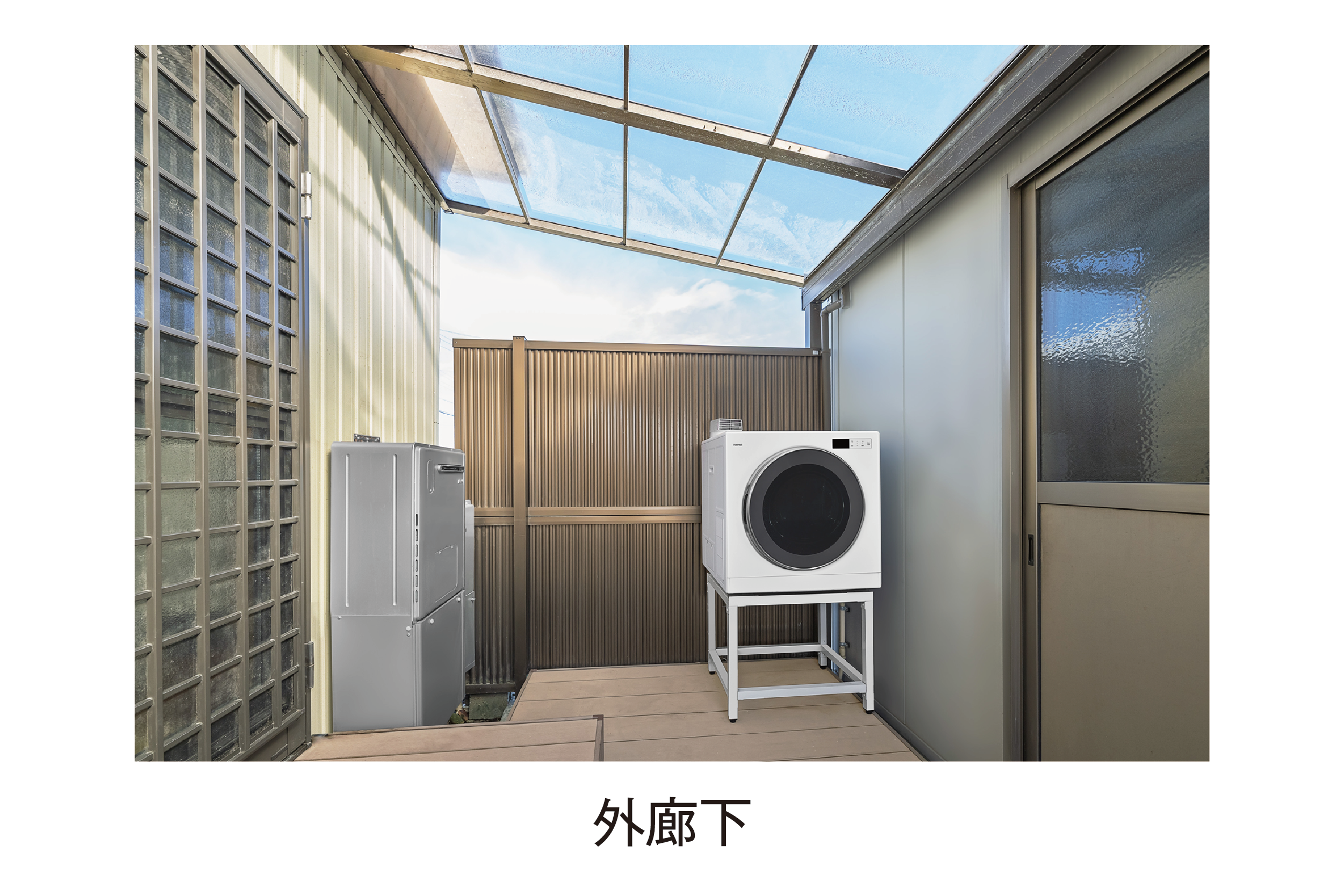 「乾太くんデラックスタイプ」の軒下設置用モデルは、雨や水が直接かからない屋外の軒下設置に対応します。戸建てや集合住宅のベランダ、庭のデッキ、外廊下などの軒下を活用することで、屋内での設置場所の確保や排湿管の穴あけ工事が難しい場合でも導入できます。