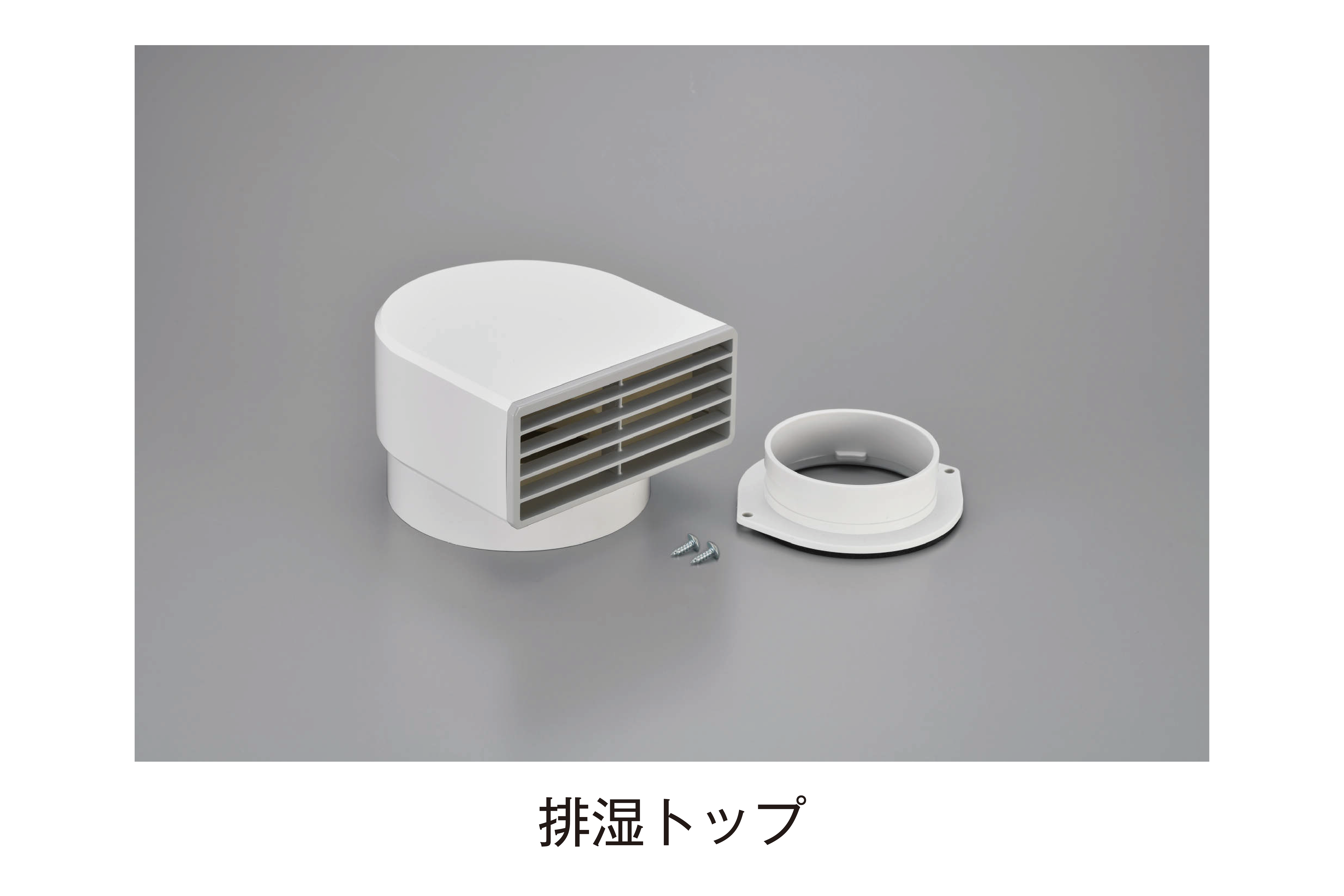 「乾太くんデラックスタイプ」軒下設置用モデルには、雨や粉塵から守る本体保護カバーと、乾燥機庫内で発生する水蒸気を外へ排出する排湿トップが付属しています。本体保護カバーを取り付けた後は、カバー前面の面ファスナーをはがし、2つ折りにして上に置くだけで乾燥機を使用することができるため、洗濯物の出し入れが簡単です。乾燥機はカバー前面を閉じた状態で運転することができます。
