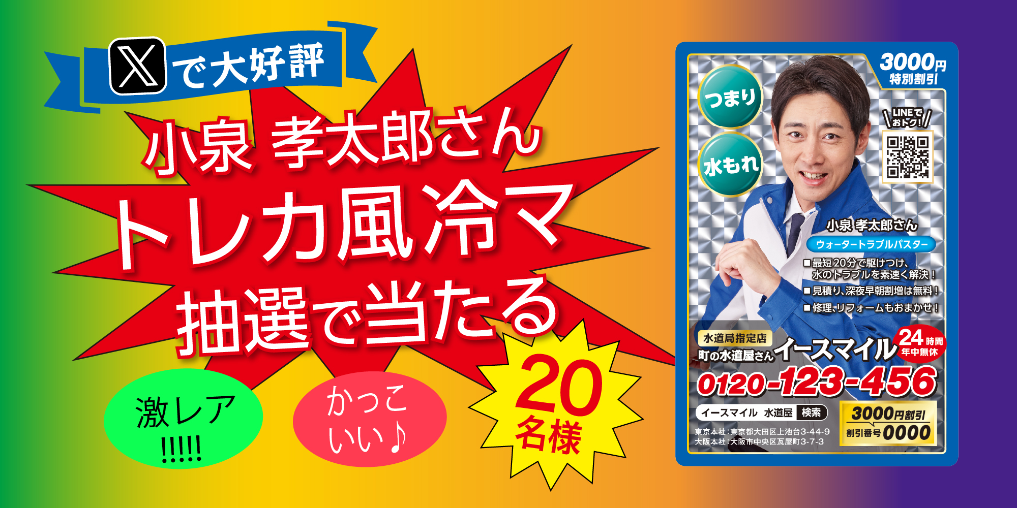 ホームキャンペーン【公式X】小泉孝太郎さんのトレカ風マグネットが抽選で当たる!【町の水道屋さんイースマイル】