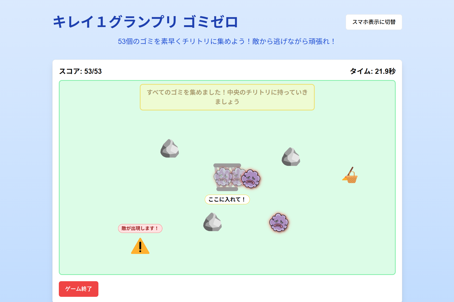 マウスでホウキとチリトリを操作し、53個のゴミをすべて集めるゲームで最高記録を競います。敵に触れるとゲームオーバーになります。