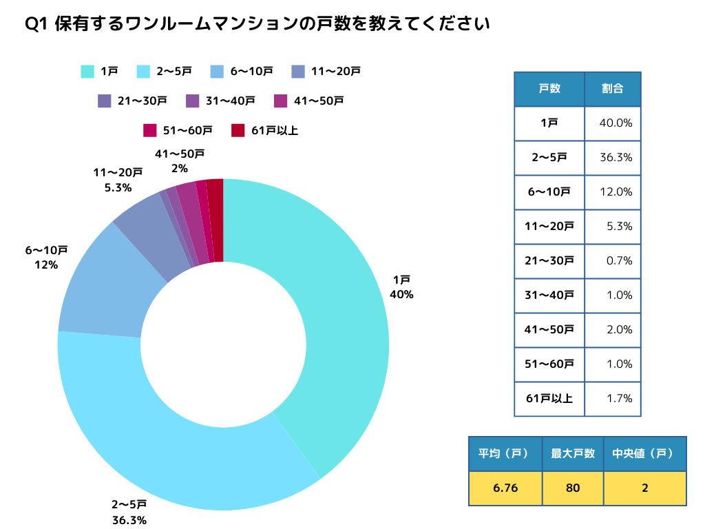 保有するワンルームマンションの戸数について尋ねた質問では、「1戸」が40.0%と最も多く、次いで「2~5戸」(36.3%)、「6~10戸」(12.0%)と続き、88.3%が10戸以下を保有していることがわかりました。