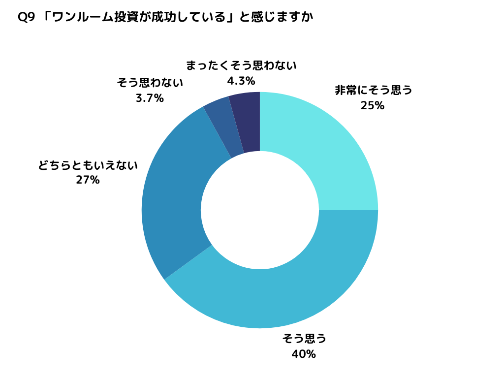 ワンルーム投資が成功しているかという質問には、「非常にそう思う」(25%)、「そう思う」(40%)と、合計65%が成功を実感していると回答しました。一方で「どちらとも言えない」が27%、「そう思わない」「まったく思わない」が合わせて8%という結果でした。