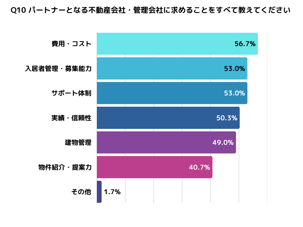投資パートナーとなる不動産会社や管理会社に求めることとしては、「費用・コスト」が56.7%と最も多く、「入居者管理・募集能力」と「サポート体制」がともに53.0%、「実績・信頼性」が50.3%と続きました。