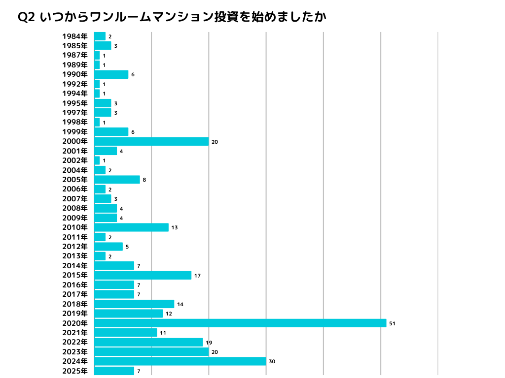 いつからワンルームマンション投資を始めたかを聞いたところ、2020年が51名と突出しており、全体の傾向としても近年参入者が多い結果となりました(平均2014年、中央値2018年6月)。