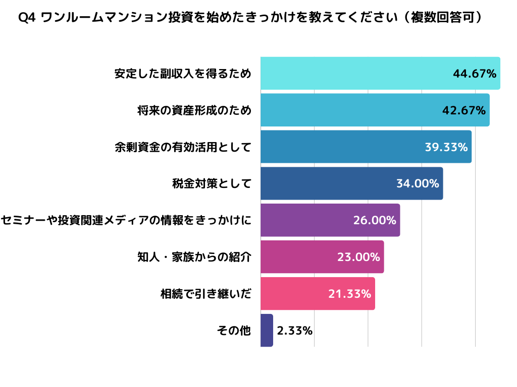ワンルームマンション投資を始めたきっかけとしては、「安定した副収入を得るため」が44.7%(134人)と最多で、続いて「将来の資産形成のため」が42.7%(128人)となりました。その他「余剰資金の有効活用」(39.3%)や「税金対策」(34.0%)も上位に挙がっています。