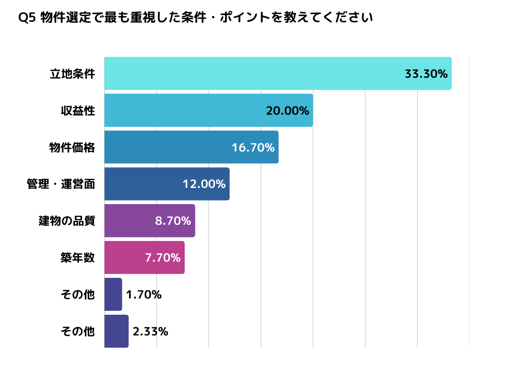 物件選択の際に最も重視した条件を聞いたところ、「立地条件」が33.3%(100人)と最多で、次いで「収益性」(20.0%)、「物件価格」(16.7%)という結果でした。