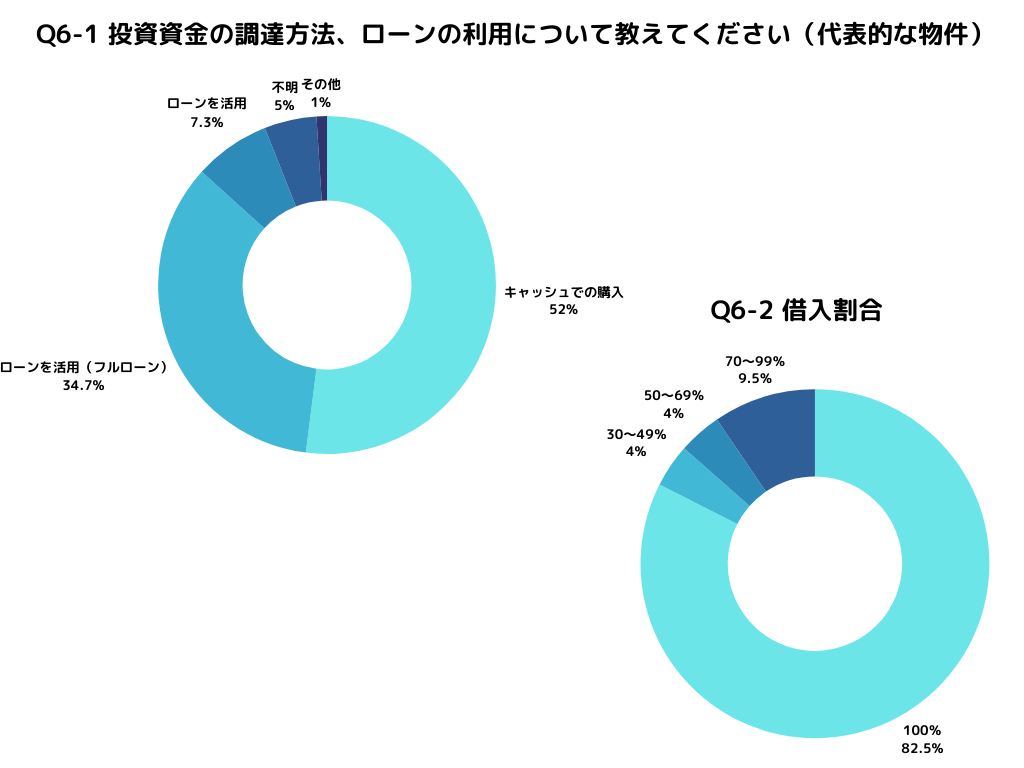 投資資金の調達方法については、「キャッシュでの購入」が52%と過半数を占める一方、「ローンを活用(フルローン)」も34.7%と3分の1以上を占めており、対照的な投資スタイルが共存しています。