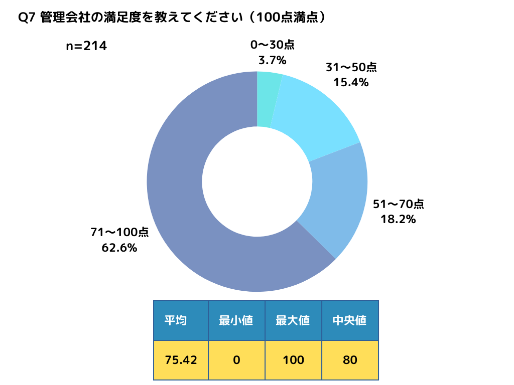 管理会社に委託している投資家214人に満足度を100点満点で尋ねたところ、平均75.42点、中央値80点と比較的高い評価が得られました。特に「71~100点」の高評価が62.6%を占めており、多くの投資家が管理会社のサービスに満足していることがわかります。