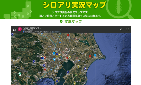 また、シロアリ実況マップのサイト内には、シロアリの群飛状況をお知らせする”羽アリ群飛アラート”と、各地のシロアリの状況が分かる”定点観測写真”も掲載しています。