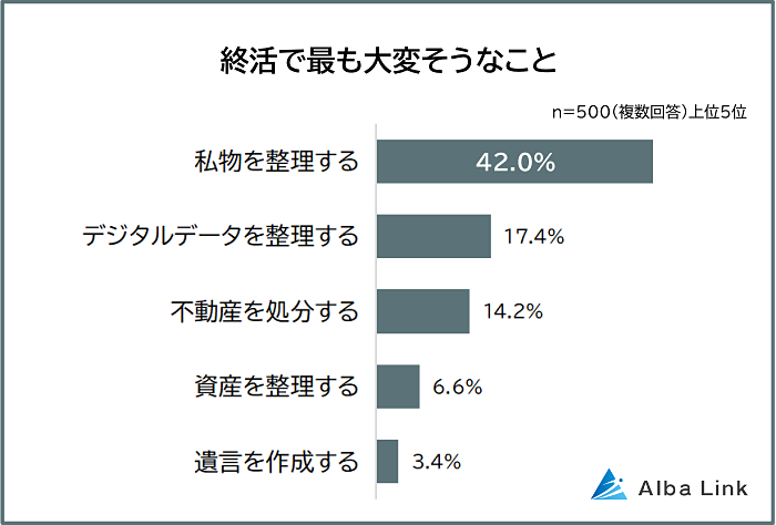 「終活で最も大変そうと感じることは何か?」という問いには、4割以上の人が「私物を整理する(42.0%)」と回答しました。2位には「デジタルデータを整理する(17.4%)」、3位には「不動産を処分する(14.2%)」がランクインしています。